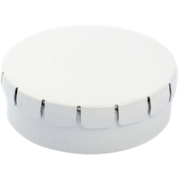 Fruit drop flavour sweets in tin container with easy-press opening. Can be ordered in a wide range of colours and filled with various fillings: mints, extra strong mints, sugar free mints, fruit drops, heart shaped strawberry, cinnamon, lemon and mint sweets, or chocolates. Can be decorated with a full colour digital print on the lid.